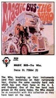 Decca releases the LP Magic Bus - The Who on Tour. A collection of Who A-sides, album tracks and leftovers, the album gets bad marks in the Underground press for its title that could mislead buyers into thinking it was a live album. Unaware of the album prior to its release, Pete is furious with Decca. Despite, or perhaps because of the confusion, the album reaches #39 on the Billboard charts making it The Who's first Top Forty album in the U.S. The LP also features a new stereo mix of "Magic Bus"