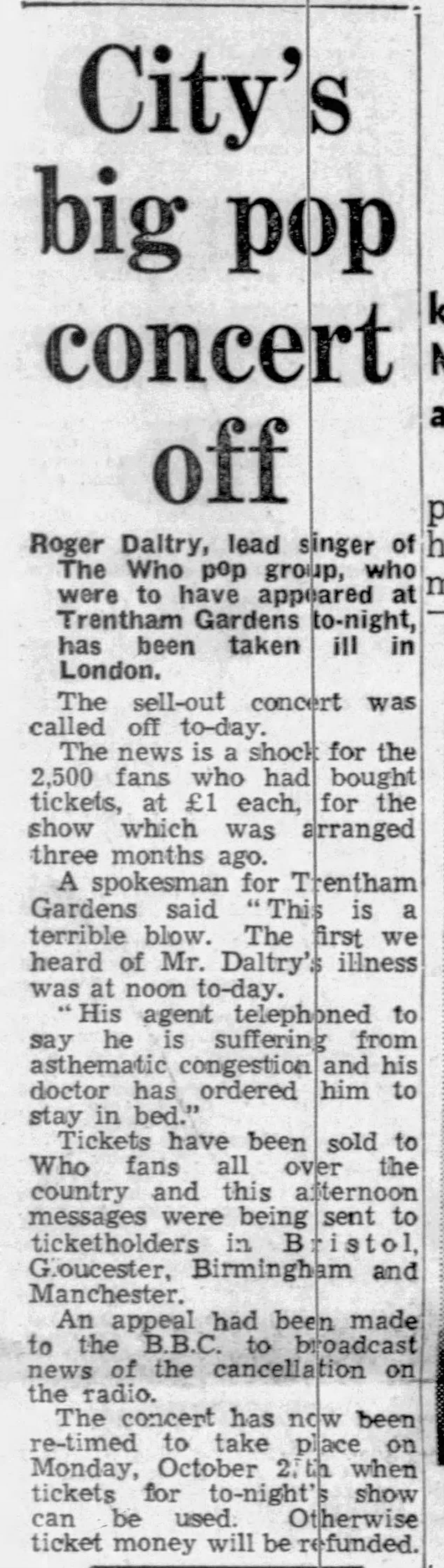 The Who were scheduled to play Trentham Gardens. The show was rescheduled for the 26th
