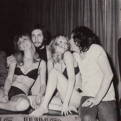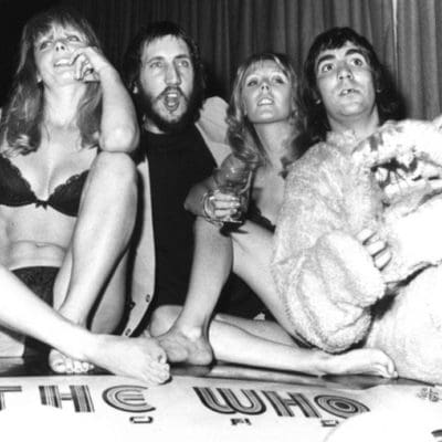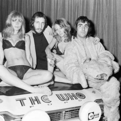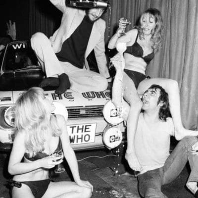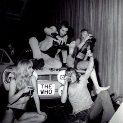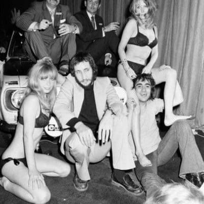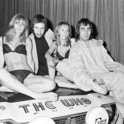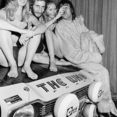 Keith and Pete attend a press party at the Europa Hotel in London to announce that The Who have sponsored a race car in the RAC Daily Mirror Rally of Great Britain. They are photographed on the hood of the car pouring champagne for two bikini-clad models.