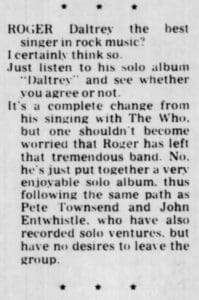 Roger Daltrey releases his first solo album, Daltrey, in the U.K. Chris Charlesworth gives the album, a collection of soft-rock tunes penned by Leo Sayer and Dave Courtney, a rave review in Melody Maker. Despite the success of the "Giving It All Away" single and Roger's promotional efforts, the album does not reach the British charts.