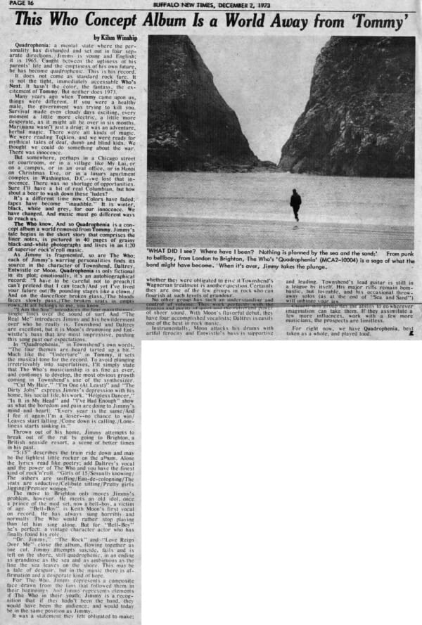 The Buffalo New Times carries a long review of Quadrophenia titled "This Who Concept Album Is a World Away from 'Tommy'" by Kim Winship