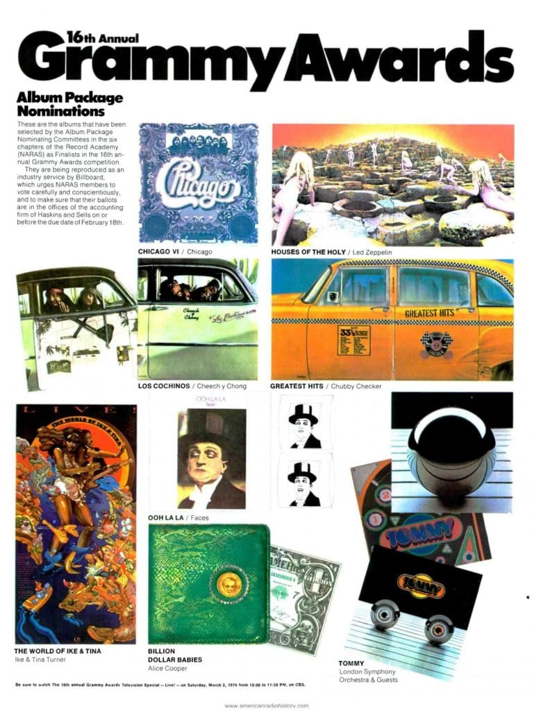 Billboard magazine carries a full page ad for The Who. There is also a list of the 16th Annual Grammy Award nominations, featuring Tommy by the London Symphony Orchestra nominated for "Album Package"