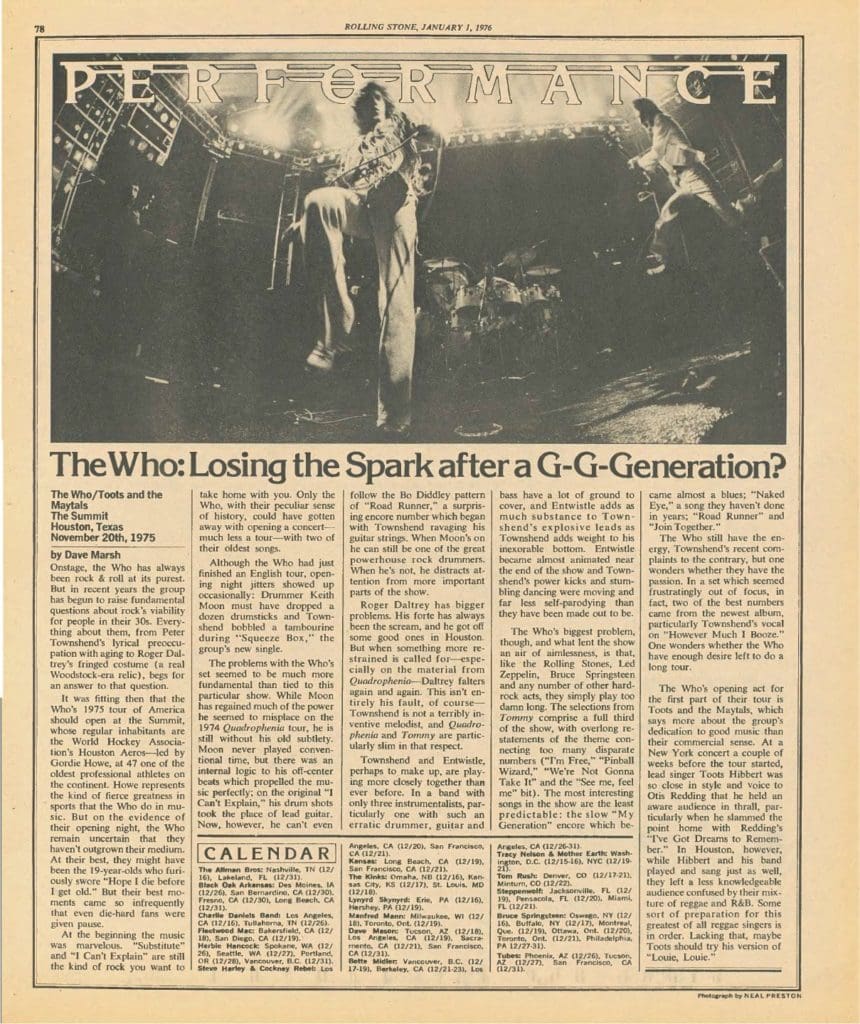 Rolling Stone magazine carries an article entitled "Who Split? They Can Explain" by Cameron Crowe. Also featured is a review of The Who in Houston on November 20th, 1975 entitled "The Who: Losing the Spark after a G-G-Generation?" by Dave Marsh