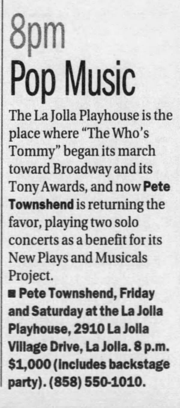 Pete performs the first of two solo concerts at the Mandell Weiss Theatre in San Diego, California as a benefit for the La Jolla Playhouse