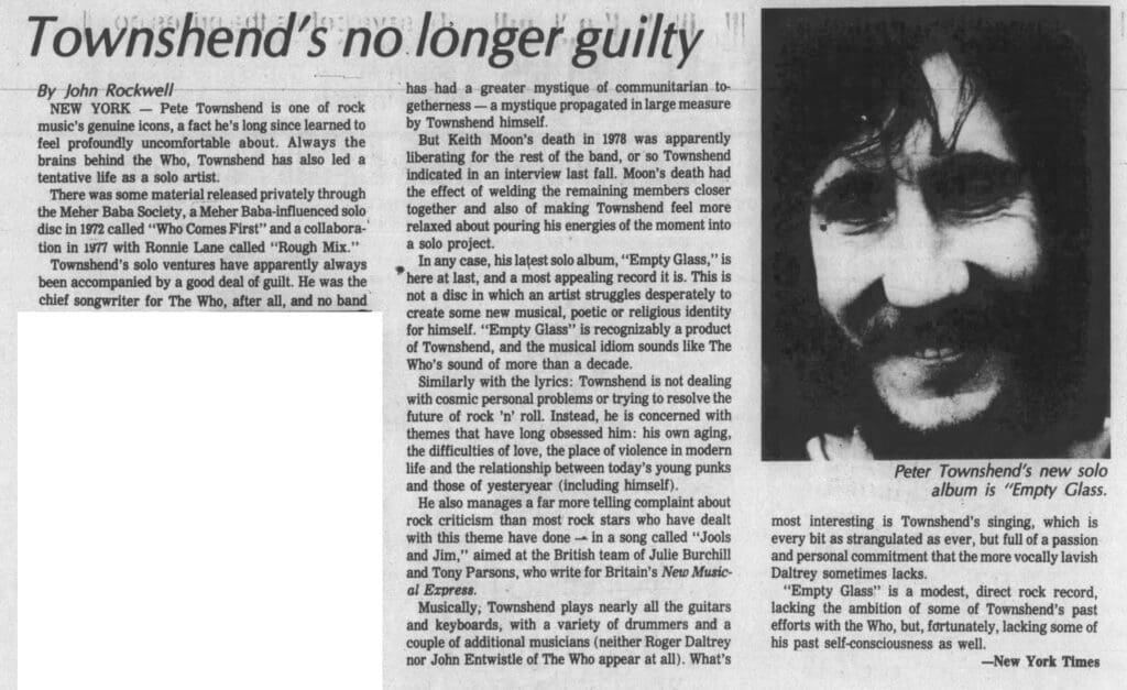 In any case, his latest solo album, "Empty Glass," is here at last, and a most appealing record it is. This is not a disc in which an artist struggles desperately to create some new musical, poetic or religious identity for himself. "Empty Glass" is recognizably a product of Townshend, and the musical idiom sounds like The Who's sound of more than a decade.