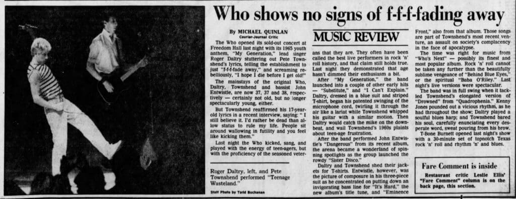 The Courier Journal carries Micael Quinlan’s review of The Who’s Freedom Hall concert the previous night