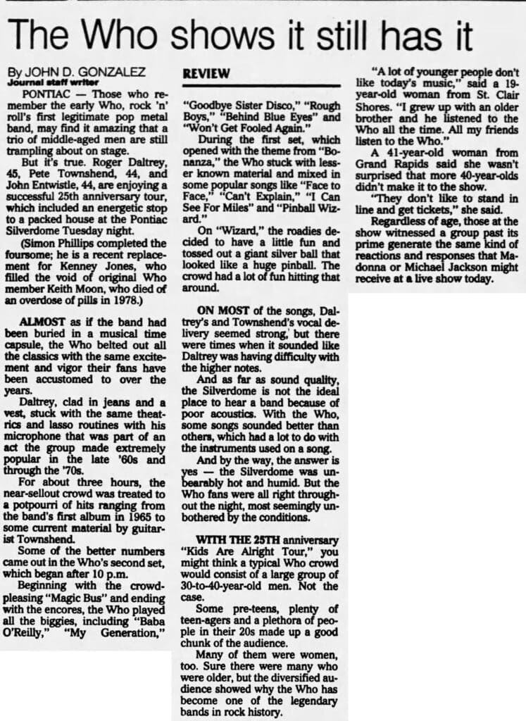 But it’s true. Roger Daltrey, 45, Pete Townshend, 44, and John Entwistle, 44, are enjoying a successful 25th anniversary tour, which included an energetic stop to a packed house at the Pontiac Silverdome Tuesday night.