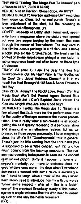 Copyright © 1997-2015 "Baba O'Riley" d/b/a Baba O'Riley's Bootleg Page All rights exclusively reserved and secured. Do NOT duplicate or redistribute in any form. Baba O'Riley's Bootleg Page has NO affiliation with The Who or any individual member of the group nor it's management. Baba O'Riley's Bootleg Page is a REGISTERED trademark. All other trademarks and registered trademarks are the property of their respective holders.