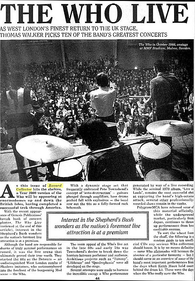 This is an article by Thomas Walker from the November, 2000 UK magazine Record Collectorfeaturing “Ten of The Band’s Greatest Concerts”, shortly before the start of The Who’s 2000 UK Tour.