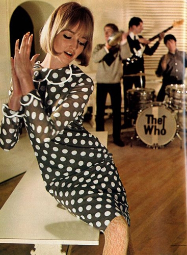 Vox (Mark IV?) Teardrop bassVox (Mark IV?) Teardrop (black with pearloid scratchplate) bass guitar appearing in promotional photo shoots, one of which appeared in the March 1965 Seventeen magazine.