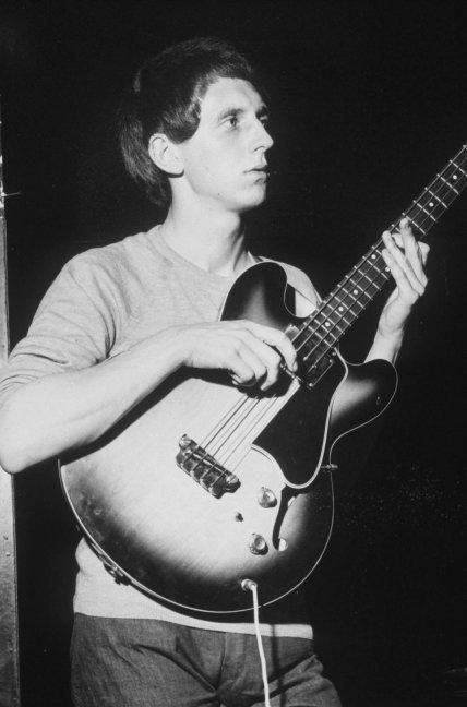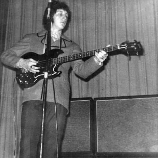 Click to view larger version. Ca. August/September 1964, at the Railway Hotel, with Epiphone Rivoli bass, and what appears to be a Marshall amplifier in the backline.
