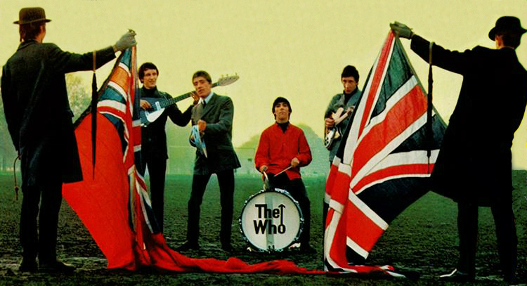 19 Nov. 1965, at the Glad Rag Ball, Wembley. Pete appears to be both playing through a (likely two) Marshall JTM45 100 Tremolo (prototype 1959T JTM100 Super Lead) 100-watt amplifier driving a Marshall 8×12 cabinet adorned with the Union Jack. John is using 1959 JTM100 Super Lead. (Marshall 1969 PA 4×12 cab visible at far left.)