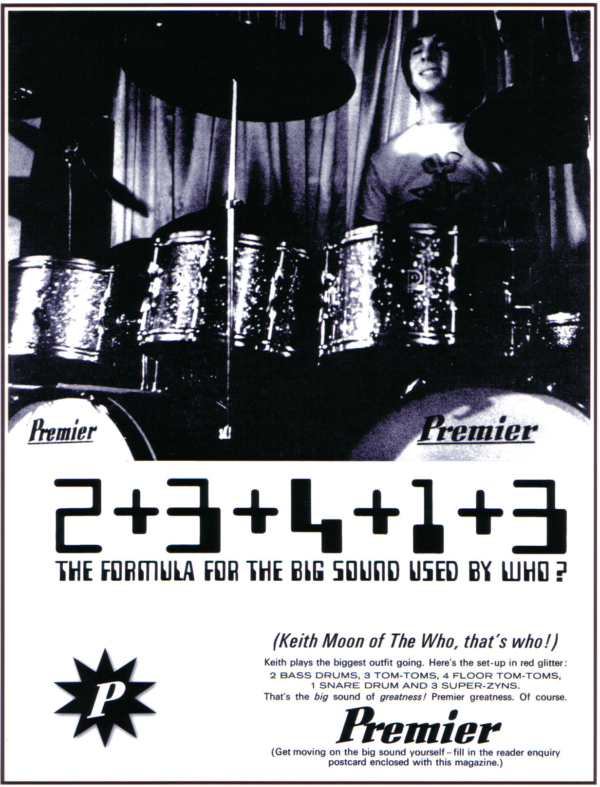 Click to view larger version. Premier ad – “2+3+4+1+3 – The formula for the big sound used by Who?” Premier ad featuring first Premier double kit, from September 1966.