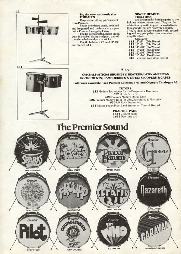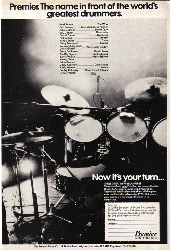 Click to view larger version. Ca. 1976, Premier drums endorsement ad. “Premier: The name in front of the world’s greatest drummers.”