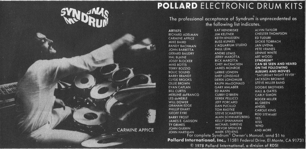 In 1978, Moon had started using Syndrums, a synthesized computer drumpad, and was listed as such in advertisements.