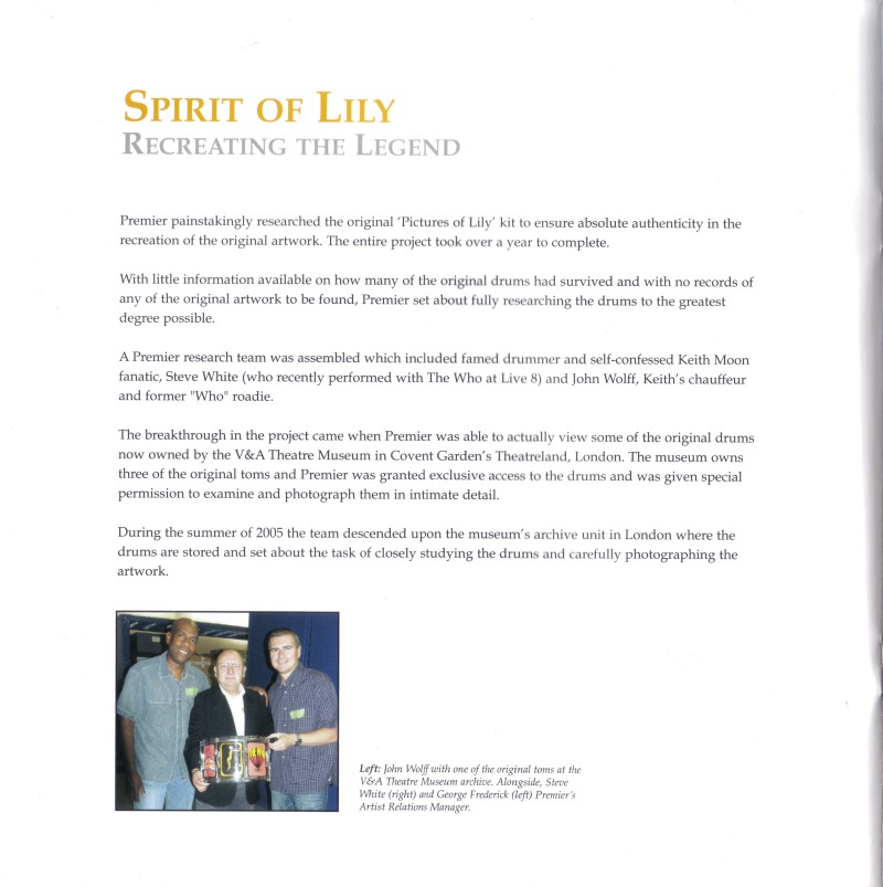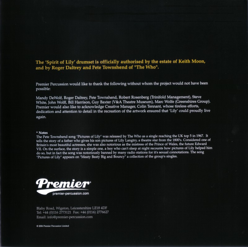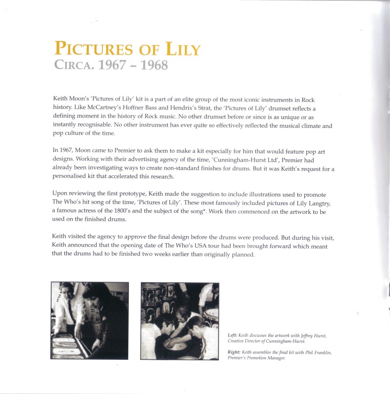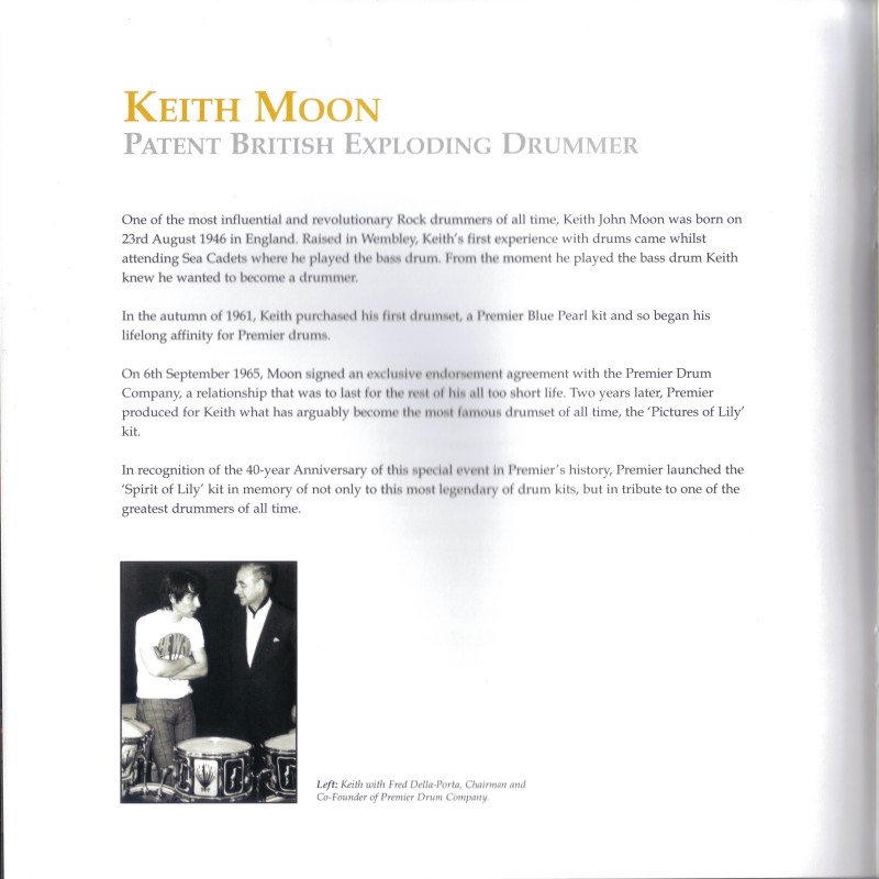 In January 2006, Premier have announced the release of a “Pictures of Lily” tribute kit, a replica of Keith’s “Pictures of Lily” Premier kit used 1967–68.